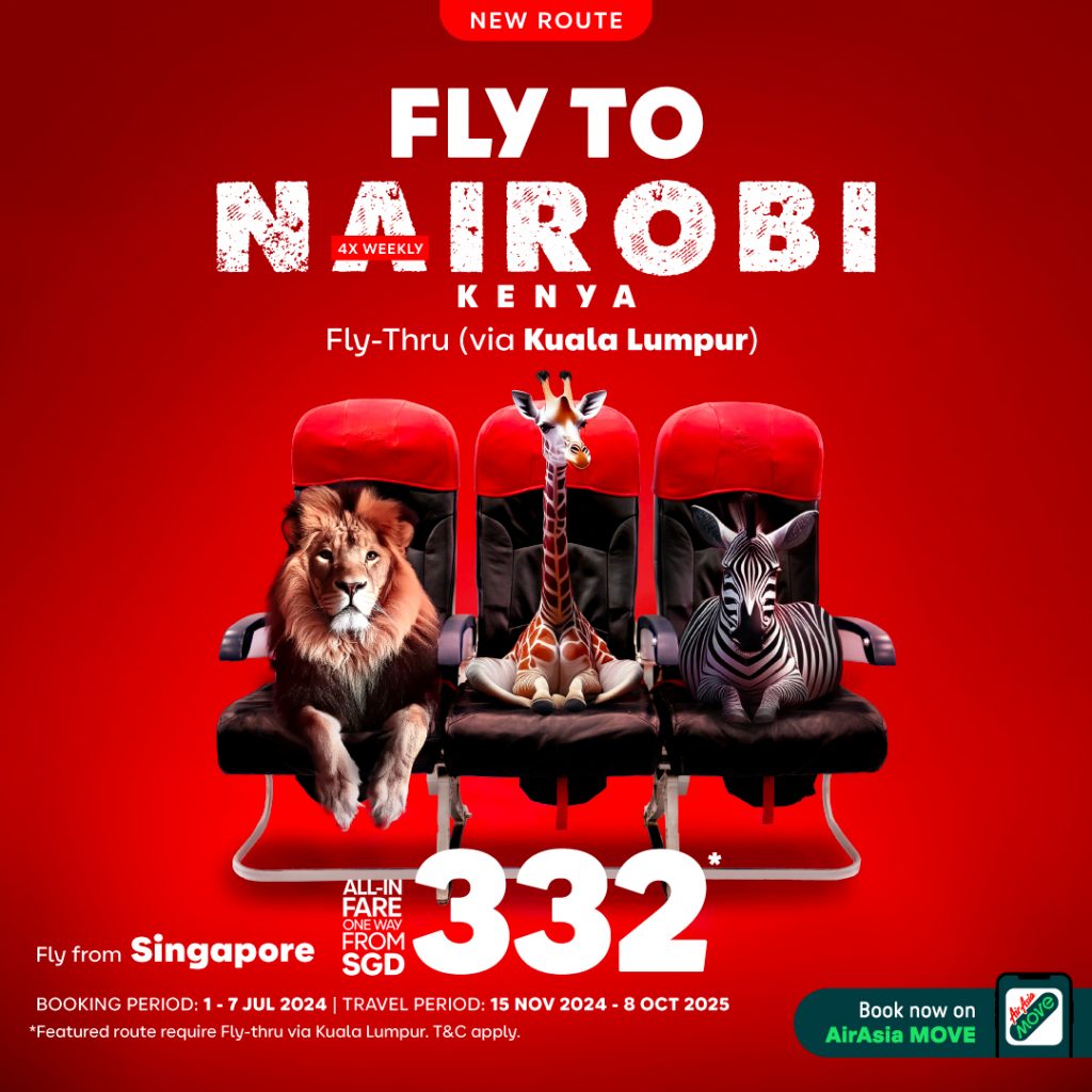 As AAX gears up to rev its engines into Africa, thrill seekers, globe trotters and nature lovers in Singapore can soon immerse themselves in the Kenyan adventure with a promotional all-in-one-way* fare from SGD 332 Singapore to Nairobi via a Fly-Thru in Kuala Lumpur. This promotion is exclusively available for booking on the AirAsia MOVE app (formerly known as the airasia Superapp) from now until 7 July 2024 for the travel period between 15 November 2024 and 8 October 2025.