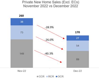 Developers posted sluggish new private home sales in December, transacting just 170 units (ex. Executive Condos) – the lowest monthly home sales tally since January 2009 where 108 units were sold. On a month-on-month basis, December’s sales were down by 34.6% from the 260 units shifted in November. Meanwhile, sales fell by nearly 74% year-on-year when compared to the 650 units transacted in December 2021.