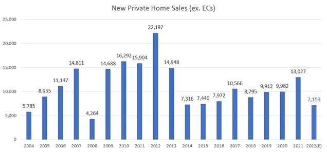 Said Ms Wong Siew Ying, Head of Research & Content, PropNex Realty: “Taking in December’s sales, developers sold an estimated 7,153 new private homes (ex. EC) in 2022, sharply down from the robust sales of 13,027 in 2021. Based on the transaction data, this would be the lowest annual new home sales since 2008 (see Chart 1). That being said, given the year that we have had in 2022, with a cocktail of challenges – from recession concerns to rising interest rates to high inflation – and a fresh bout of cooling measures in September, we think the new homes sales upwards of 7,100 units are quite decent.